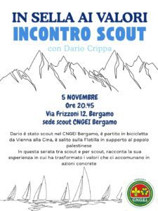 Nella sera del 5 novembre, presso la sede CNGEI di Bergamo di via Frizzoni, si è svolto l’incontro “In sella ai valori”, un momento speciale che ha riunito scout di diverse realtà per ascoltare il racconto di Dario Crippa, ex scout bergamasco protagonista di imprese che hanno attraversato confini geografici e umani: dal viaggio in bicicletta da Vienna alla Cina alla partecipazione alla Flottilla in supporto al popolo palestinese.